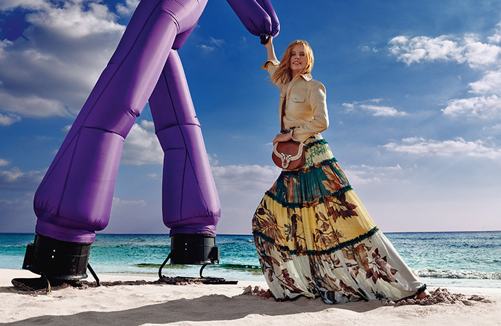 Fashion house PINKO presented their Spring Summer 2021 campaign featuring top model Elisabeth Erm and the great purple man Peter Dance lensed on the beach in Italy by photographer Federico De Angelis. In charge of styling was Carola Bianchi, with creative direction from Riccardo Ruini. Pinko woman has had enough of standing still, staying at home, and dressing only for herself.